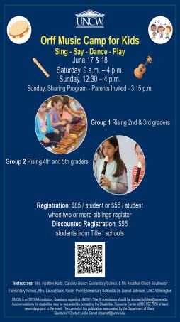 Orff Music Camp for Kids - Sing, Say, Dance, Play. June 17 & 18, Saturday 9:00 a.m. - 4:00 p.m. and Sunday, 12:30 - 4:00 p.m. Group 1 - Rising 2nd & 3rd graders - Group 2 - Rising 4th and 5th graders.