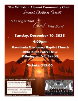 The Williston Alumni Community Choir presents its Annual Christmas Concert on Sunday, December 10, 2023 at 4:00pm at Macedonia Missionary Baptist Church located at 4925 New Centre Drive, Wilmington, NC 28403. The annual concert will feature the exceptional voices of our talented alumni with songs of the holiday season as well as soulful gospel and spiritual melodies.