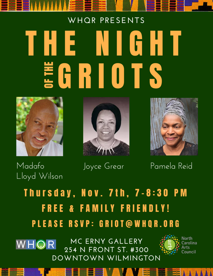 WHQR is proud to host “The Night of The Griots: Family, Community, Inspiration, Hope” in the MC Erny Gallery November 7, 2019 from 7-8:30pm. Primarily concerned with preserving oral tradition, a griot is a West African storyteller. Speakers from the National Association of Black Storytellers will share narratives of family, community, inspiration, and hope.