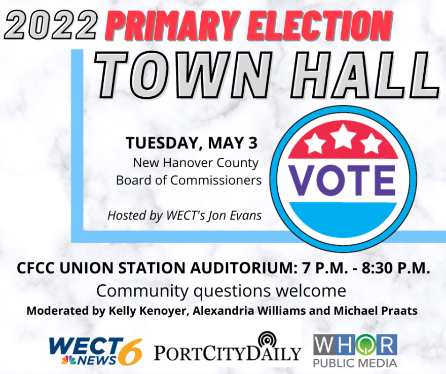 The Town Hall events will feature Republican and Democratic candidates for the 2022 Board of Commissioners primary race in New Hanover County. Moderators will ask questions from our newsrooms and the public, including questions from attendees and questions we receive online prior to the event here.