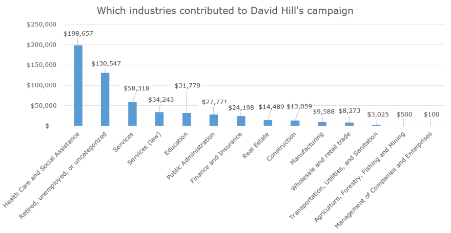 The industries donating to Hill were health care and social assistance; retired, unemployed, or uncategorized; and various services. He had 1,085 donations exceeding $50.