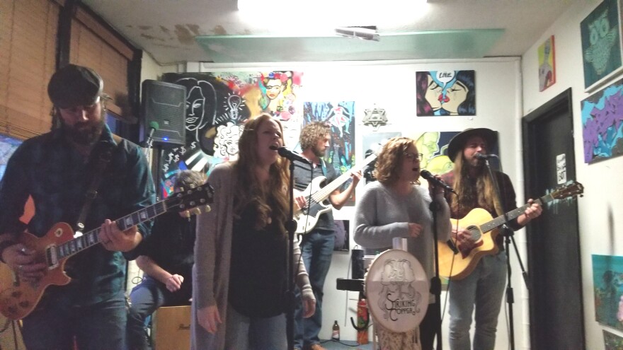 Striking Copper is led by twin sisters Allison and Jacqueline Lee. The band also features Daniel Bennett, Joseph Dail, Matthew Donnelly and Frank Cacciutto. They were recorded on the small stage inside Bottega Art & Wine.